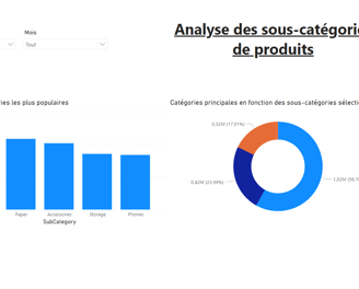 Pour finir nous avons analysé les sous-catégories de produits dans notre rapport Power BI et avons identifié et présenté les sous-catégories les plus populaires, ainsi que les catégories principales associées. Cette partie du rapport a permis de mettre en évidence les tendances de consommation et les préférences des clients, fournissant des informations clés pour l'orientation des stratégies de stock et de marketing.